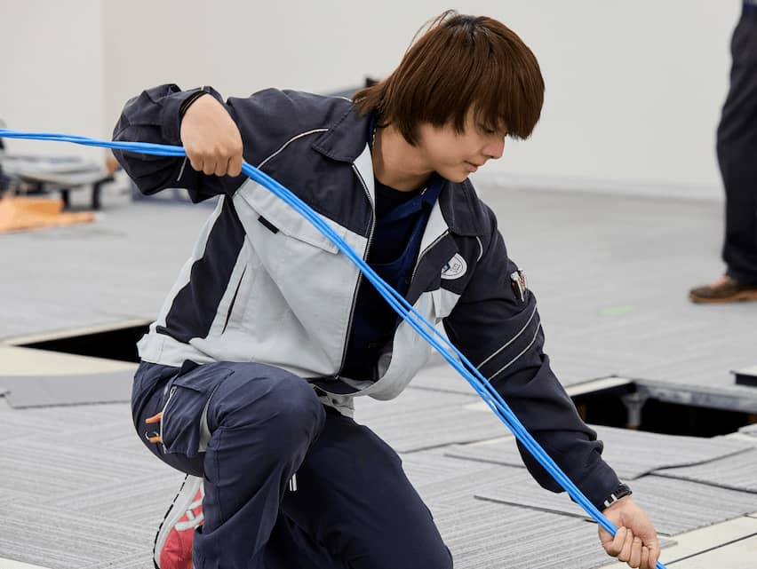 もともとアパレルで働いていました。結婚して子どもが産まれたので、土日休みの仕事がいいなぁと考えた時に、父と祖父が働いている明成通信が頭に浮かんだ。インフラに関わる仕事。将来も安定している。高校は情報系だったので工事の仕事はまったくの素人。でも、努力でなんとかなる、とのことだったので入社を決意。入社後は、コンストラクション部門で工事を担当。職人さんと連携しながらの仕事です。最初の頃は、専門用語がわからないので「バンドソー持ってきて」と言われて絆創膏を持っていって笑われたことも。バンドソーとは、バンドで動くチェーンソーのような器具。今は研修が充実しているので、事前に基礎を学んで現場に行きますが、僕の新人時代は先輩や職人さんたちに現場で教えてもらいながらの毎日でした。