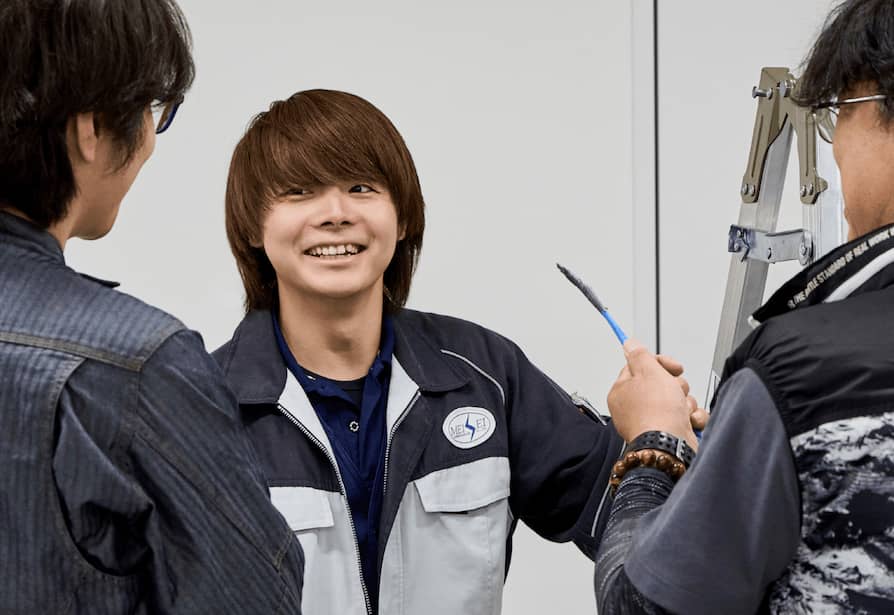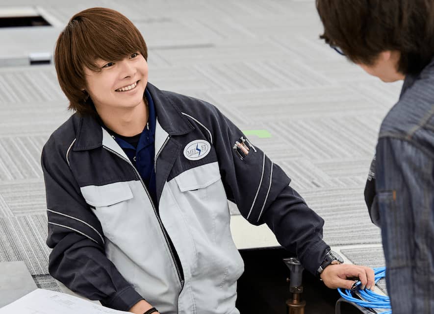 人の成長を一番に考えている会社だと思います。第二種電気工事士や工事担任者(総合通信)などの資格も、試験費用フルサポート。e-ラーニング研修などもあり、この数年でどんどん充実した印象です。社長との距離が近くて、社長面談もあるんですが、若手の意見をどんどん拾って反映してくれるんですよ。最近では、若手の意見で作業着のデザインが変わりました。安全靴などの身に着けるものや道具の購入には、会社の先輩が付き添ってあげることも。もちろん費用は会社負担。明成通信のロゴ入りの服もできました。若い人もベテランも、みんなで力を合わせてもっといい会社にしていきたいと思っています。